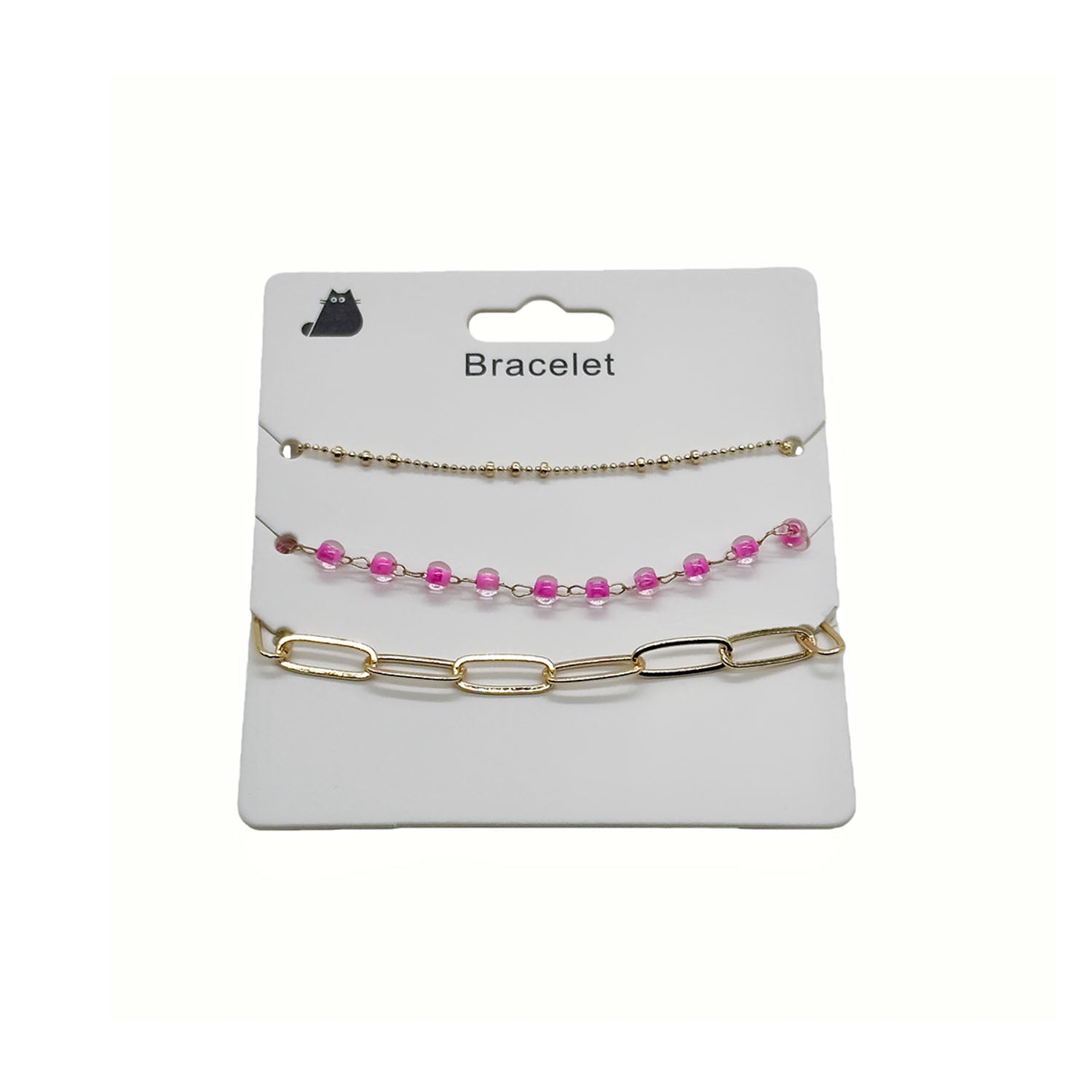 A set of three stylish bracelets featuring different designs for everyday wear. Includes a gold-tone beaded chain, a delicate pink bead strand, and a large link chain bracelet. Can be worn together or separately to complement different looks.