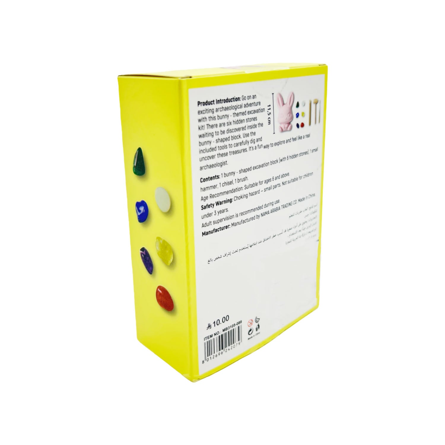 This excavation kit features a pink rabbit sculpture with six hidden stones to discover. It includes tools like a hammer and brush, encouraging patience and focus for children.